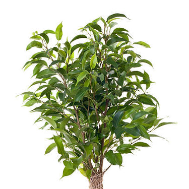 The Ficus Benjamina, often called the weeping fig, is an attractive small tree featuring glossy, deep green leaves that are oval with pointed tips. Its graceful, drooping growth pattern makes it a charming addition to any space.