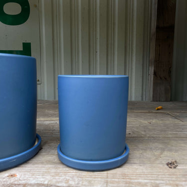 Classic straight sided cylinder with drainage hole and detached matching saucer.