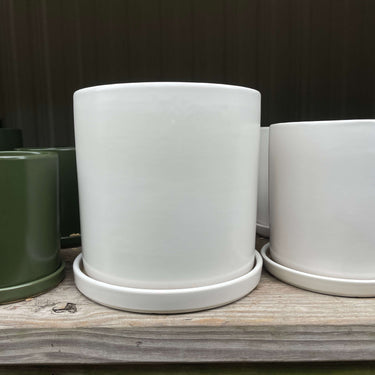 Classic straight sided cylinder with drainage hole and detached matching saucer.