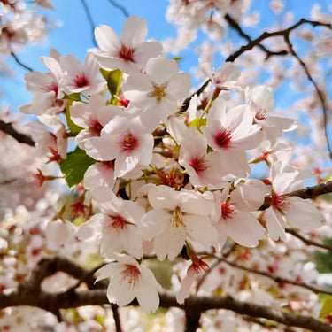 A graceful, deciduous flowering cherry tree known for its iconic spring displays in Japan, Washington, D.C., and New York City. Produces large, almond-scented, single blossoms that are blush white or tinged with soft pink and a darker center. The flowers appear before the foliage in early spring, creating a romantic, cloud-like effect.