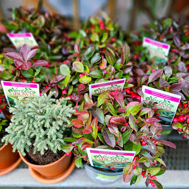 Year-round color for containers, window boxes, and small gardens! An attractive, evergreen groundcover that saves its best show for fall and winter with red-tinged, dark green foliage. Dense, compact and hardy with edible berries that shine through fall and winter, adding festive cheer. Low-maintenance, versatile, and compact, it thrives in part sun to part shade -- ideal for Brooklyn gardens.