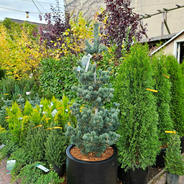 A narrower, more compact and upright form with short blue green to gray needles. Widely used as a bonsai or container plant. An easy to care for evergreen that works beautifully as a landscape specimen.