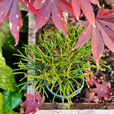 A dynamic dwarf evergreen with long, glossy tendrils that twist and curl like playful sparks. Green in summer and bronze in winter, this compact conifer adds year-round texture and visual interest.